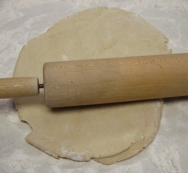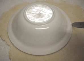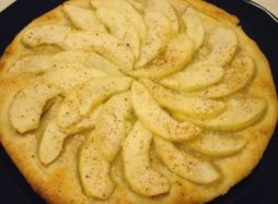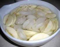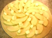 Begin by slicing the apple (cored and peeled) in thin, even slices. I keep my slices in a bowl of ice water to keep them from browning while I prepare the dough, then drain on a paper towel a few seconds before arranging on the dough. Some people may use a little lemon, but I want the apples to taste natural.