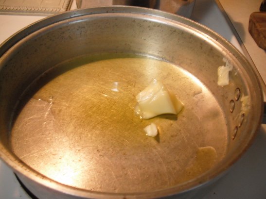Add Butter and Olive oil to a skillet over Medium Heat. You don't want to do this on high heat. Cooking the onions too fast will burn them and not allow the sugars to develope