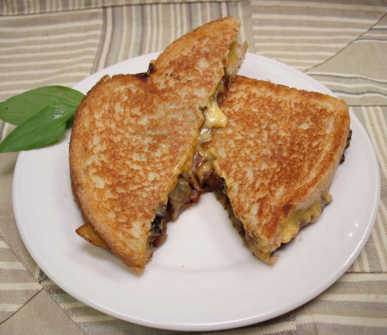 Last night I used them on a grilled cheese and caramelized onions Quesadilla. Grab up two large flour tortillas, pile one with shredded cheddar cheese and the onions. Butter a flat griddle and get it hot, place the tortilla with the cheese/onions on it. Then put another tortilla on top and grill it till very lightly browned on the bottom. (you have to be sure the cheese is partially melted when you flip this or you'll have cheese everywhere) Use a large spatula and carefully flip it over to lightly brown the other side. Transfer to a plate and cut into wedges, with a huge dollop of sour cream and chopped basil in the center of the plate to serve. This is a great movie snack for two!