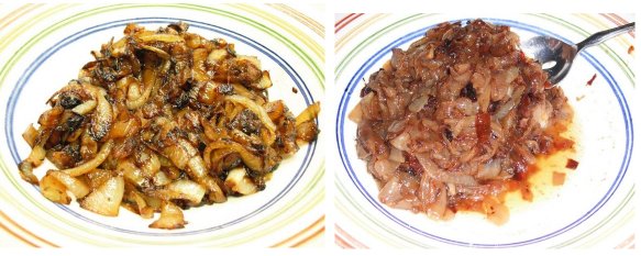 And just for kicks, I thought I would show the difference in the crockpot and coventional methods of making caramelized onions for my own attempt. The crock method took literally the whole day. The amount of attention that I had to keep giving the onions, stirring...removing the lid to allow excess moisture out, changing the heat setting from high to low and back again....well, I'll stick with the skillet method to save tons of time and get the texture and flavor I need. The crock pot method turned up soggy, textureless and off color results.