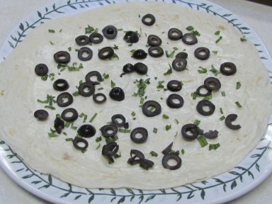 Spread Mayo on the tortilla keeping an inch or so from the edges. Sprinkle chopped basil (or whatever herb you like), then dot with some black or green olives.