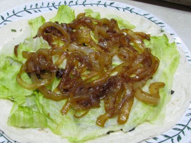 I made up some Tortilla wraps with lettuce, mayo, carmelized onions, sliced black olives, ham and cheese, and sprinkled in some chopped basil.