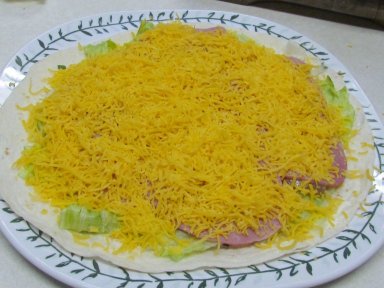 Now add a layer of shaved ham slices, or turkey. Then sprinkle with shredded cheddar cheese. You might use a little less cheese than I did, it was tough to roll without it coming out the ends.