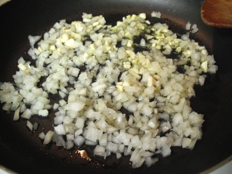 While the pasta is cooking, heat up the olive oil in a saute pan on medium heat. Add the onions and garlic and cook them till just soft and fragrant.