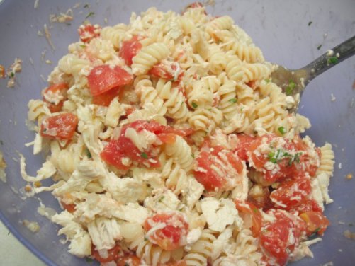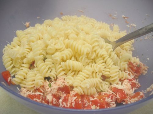 Mix together the pasta, tomatoes and juice and mozzarella cheese.