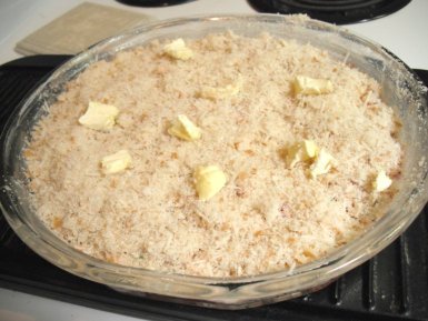 Dot with the butter. Place it in the oven and cook for about 30 minutes or until the top is golden.