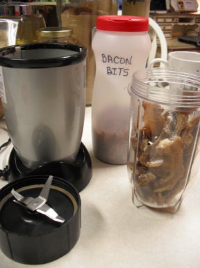 Fry up your bacon until crisp and let it drain out on a paper towel and cool completely. Then put the pieces into a food processor or "Bullet" system as I have here, and process till they are the size you want. Keep in the refrigerator in a container marked "Bacon bits". They will last a long time. You can shake these on lots of different things, including garlic cheese breads or top off casseroles with them. They are very versatile and add just a bit of crunch and taste to any dish you like.