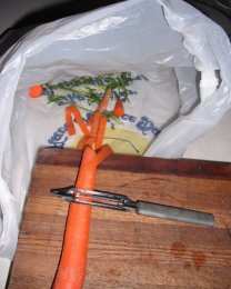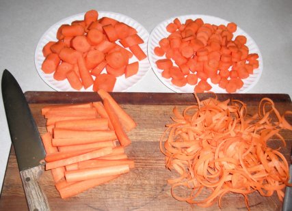 First wash and peel the carrots. I peel carrots and other veggies over my cutting board with a plastic grocery bag at the corner to catch the peels. Easy clean up! Then use the bag throughout the day for garbage while preparing your foods.