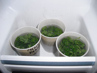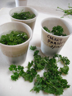 My first project for this subject is going to break or confirm the suggestions about freezing certain foods for later use. My concentration on this first project will be freezing parsley. I have found many people on the Internet who say you can freeze fresh parsley with very good results for later use by putting the chopped up parsley into ice cube trays, filling with water then freeze. As you need the herb, you just take out as many "parsley cubes" as you need and thaw them and drain/dry the herb. I have a test going as pictured here. Instead of Ice cube trays, I am using the little waxy drink cups. I filled each cup about 1/2 with the curly Parsley and then filled them with water just enough to cover the herb. I pushed the parsley down a bit to release any air bubbles hanging on them. Then I placed them in the freezer. I will leave them for a week or so, then thaw and see just what the results are. Will they be mushy? Brown and wilted? Will they have any flavor? Stay tuned.....