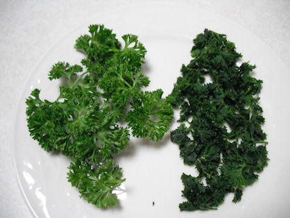 Here it is after it dried enough. You can see the comparison to fresh parsley as far as the color. It's dark and dreary as opposed to fresh and green.