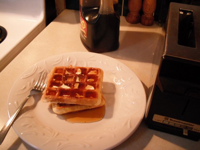 Waffles: I make a large mixture of Bisquick waffle mix, enough to make a couple dozen waffles. I cook up all of the waffles in the waffle maker and let them cool on wire racks. Then I freeze them, 4 per ziplock bag. I take them out as I want them and pop them in the toaster. They taste great and it's a quick on-the-go breakfast.