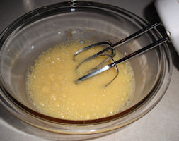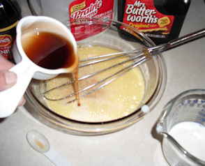 Beat the eggs till well blended. Then add the syrup, milk, and vanilla. Whisk until well mixed.