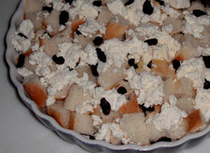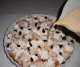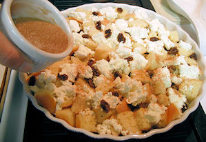 Pour the liquid mixture over the top of the bread evenly, circling around to soak all of the bread cubes as you can.
