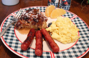 This recipe is from a Cook Book called "Easy Home Cooking Country Casseroles". by Publications International, LTD. I bought the book back in 1997. It's certainly a different approach to French toast and it really fills you up when you've got the major morning hungers growling. It should be made the night before you plan to cook it for the best results, but a minimum of 4 hours ahead of baking will do well too. I've made this several times and there are never any throw outs from too long in the fridge with the left overs. (It's been a good late night snack now and then)