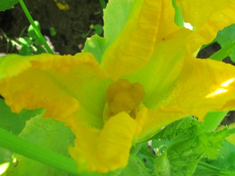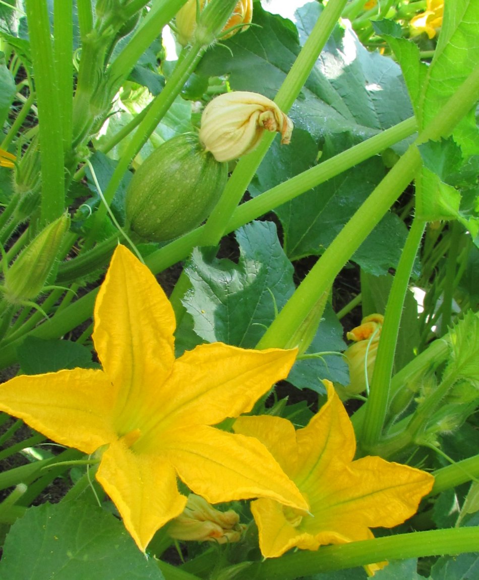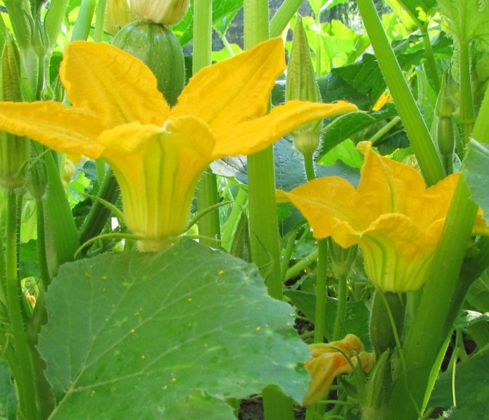 This is actually spaghetti squash. But the flowers and process are the same. Click on the picture and look at the inside of the flowers. You can just see the difference in the stamens between male and female blossoms.