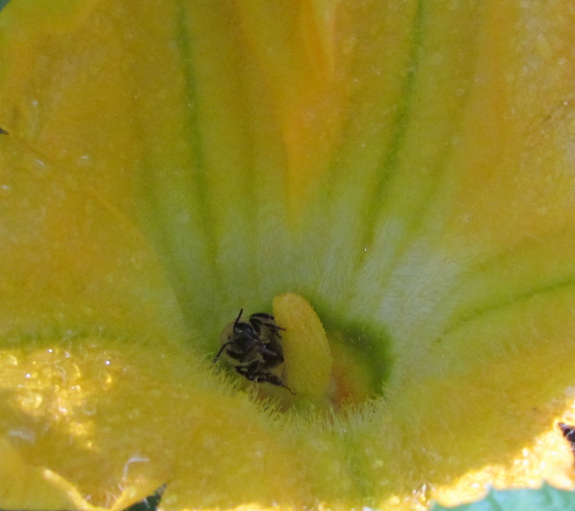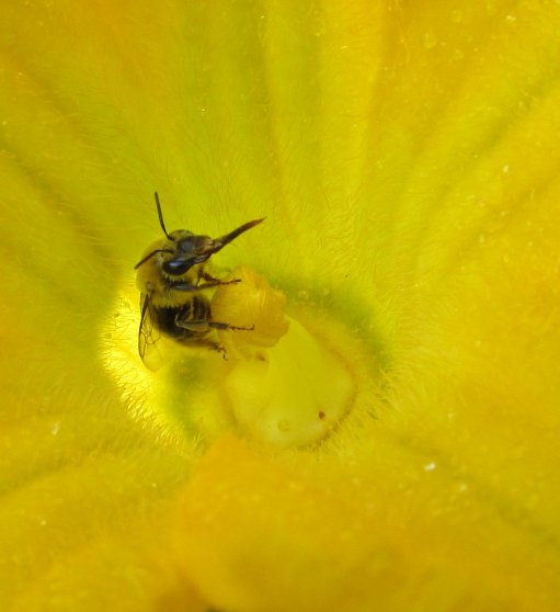 The bee then travels on to other blossoms, including the female, and leave pollen from the male blossom.