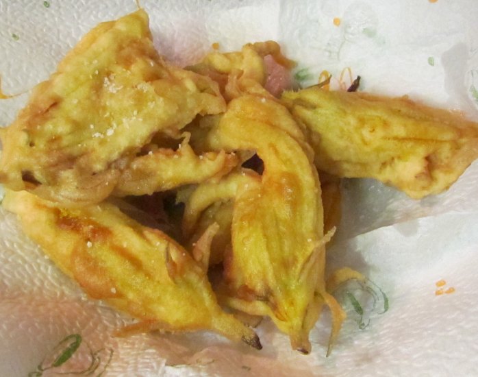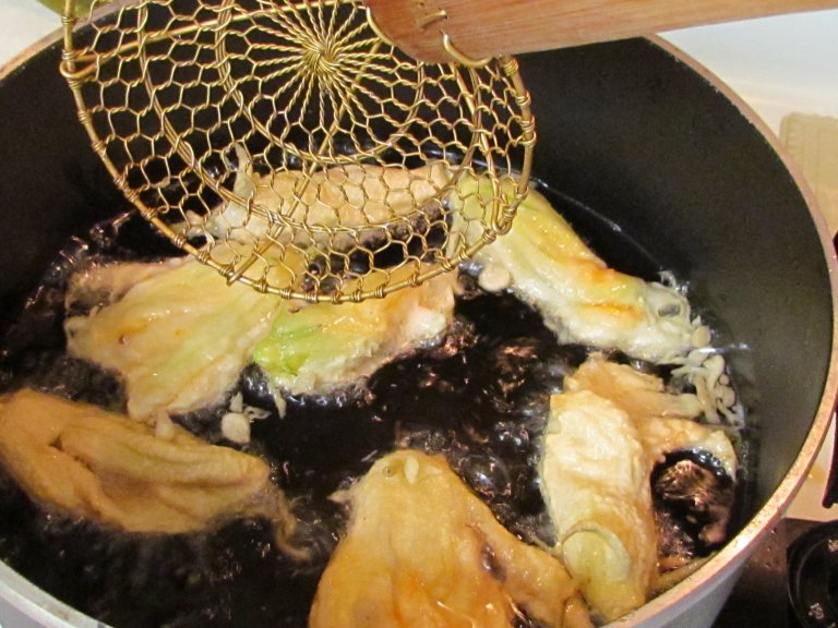 Let them fry a couple of minutes, then gently turn the over. You want a golden brown, not a dark brown. If you get them too dark the blossom pretty much disintegrates. I liked them best when I could still see a slight amount of green showing