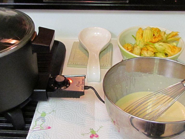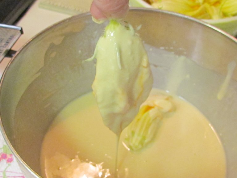 Here is why it's important when cutting them from the plants to leave a partial stem on the blossom. You need something to hold on to when you dip in the batter. Dip them and get them covered, then drip the excess off.