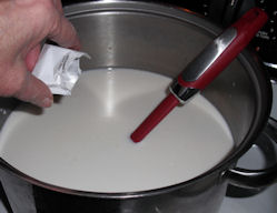 Add the Mesophilic powder packet and let it set for a minute on top of the milk. Then stir it in. Use an up and down stirring motion. From the bottom to the top. Then add 1 tsp of the diluted rennet. Stir it in for two minutes using the same bottom to top motion.