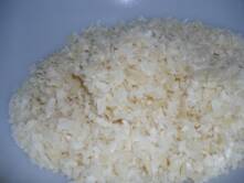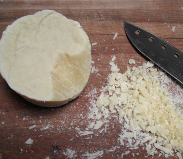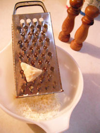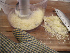 If you had viewed my recipe on Chicken Linguini with Shredded "Gouda", you'll know that my attempt at homemade Gouda cheese did not fare so well on the process. I wound up with a hard brick of cheese similar to a parmesan in taste and texture. There was no cutting this up to eat on crackers, and it was not going to "spread" on anything. ;-) After tasting it, I decided it was worth saving as a hard cheese. It tasted very much like parmesan, a little nutty flavor and a bit of saltiness too. The following is how I processed it after using a small amount of it in the Chicken Linguini recipe.