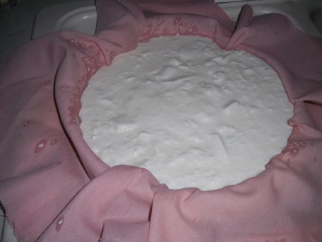 I have a large plastic colander in the sink with a thoroughly cleaned...and cleaned again pillow case to drain the curd in. After pouring it in I tied it closed with heavy string. This is a job, so be patient with it. The main thing is to be sure you have enough fabric or cheesecloth to be able to tie it up without having openings on the edges where the curd can fall out.