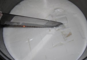 Now the curd is formed. The liquid you see is the whey. It's time to drain the curd.