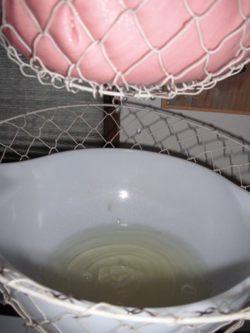 After 6 hours you can see that the bulk of the curd has reduced by more than half. I tied the top to the bar it was hanging on to get it dripping faster, then I squeezed the top down some more and tied again. Now it will go through about 1 1/2 hours more of dripping.