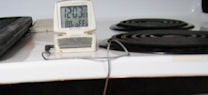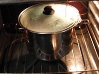Now cover the pan and place it in an area that will maintain at least 72 degrees for 12 hours. (depending on temperature/humidity etc. this can take up to 18 hours) I placed mine in the oven with an electronic temperature unit that sits outside the oven and has a probe that sits in the milk.