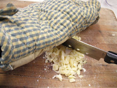 This is what I began with. It was difficult to keep trying to chop off pieces, so I placed the whole brick of cheese into a plastic freezer bag and got my trusty meat mallet out and went to breaking it up into manageable pieces. No more flying bits of cheese everywhere!