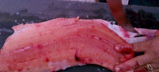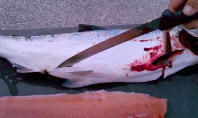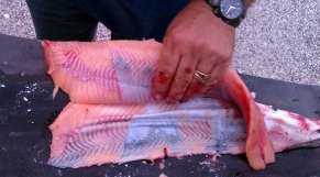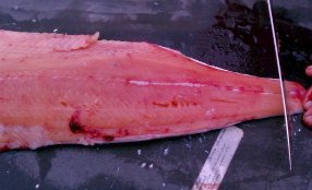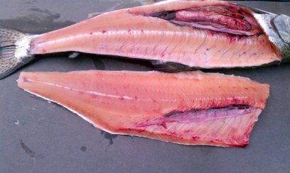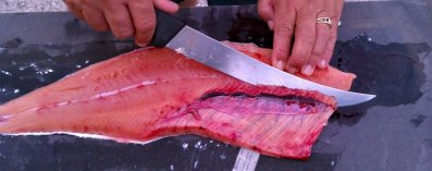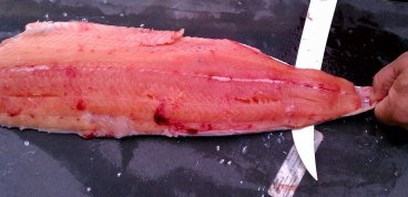 We got a bit interrupted on this final step and wound up with some of the silver skin still on the fillet. If that happens, just take your knife along the silver and shave it off. You want to remove that because it can give an unpleasant "fishy" taste.