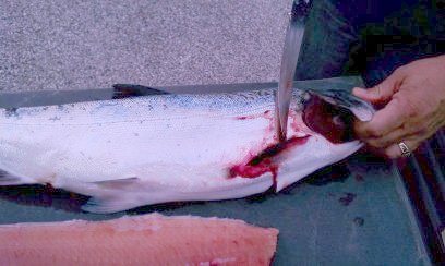 Begin by making a cut just before the Gill plate on one side. Don't cut through the backbone, cut slightly at an angle and just until you hit the bones. You don't want to cut the head off here, just cut through one side.