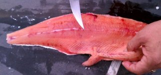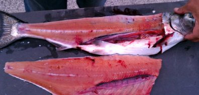 Now slice the fish open starting at one end of your angular cut and going around the first set of belly fins up to the last fin.