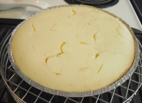 Place the pie on a cookie sheet so it is easy to transfer to and out of the oven. Bake it at 350 degrees for 35 to 40 minutes or until the center is still slightly jiggly and there is a slight color starting on the edges of the pie. Do not cook it past this stage or you will wind up with a dry cheesecake. It will set while it is cooling.