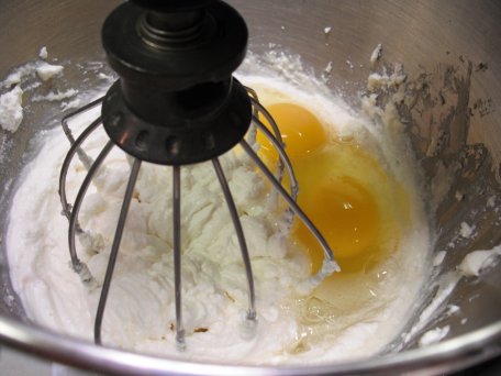 Turn the blender down to low speed and mix in the eggs. Just until blended. Don't overmix at this point.