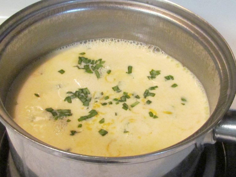 In a saucepan mix together the chicken broth, cream, lemon juice and salt. Heat to just under boiling over med. heat. Don't scald it.