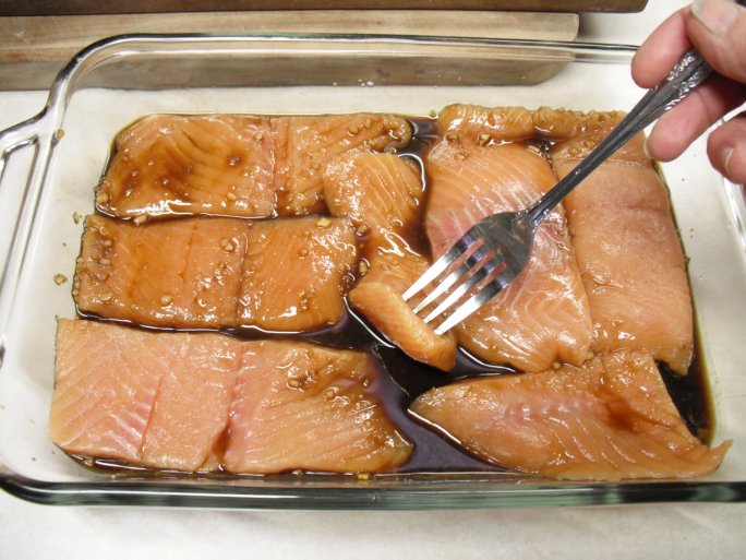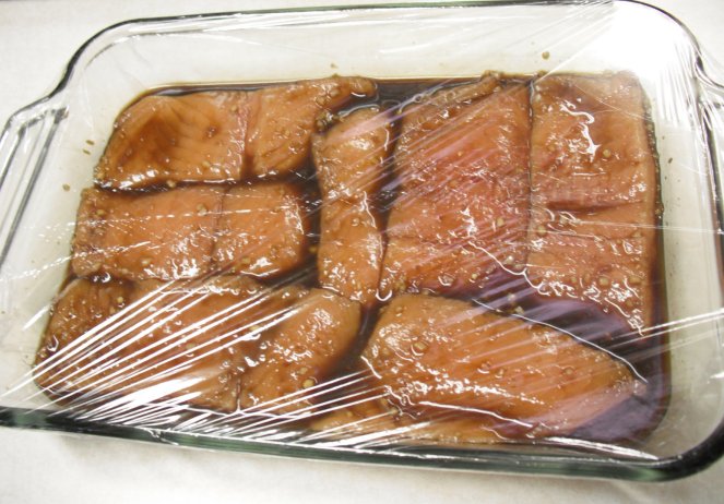 Cover the baking dish with foil and bake the fillets in the marinade at 350 degrees for about 15 minutes. Salmon fillets will generally take about 10 minutes per inch of thickness to cook. We like ours a little more done, but not so much as to dry it out. It should be flaky, but not mushy. When they are done, remove them from the baking dish and put them on a plate.
