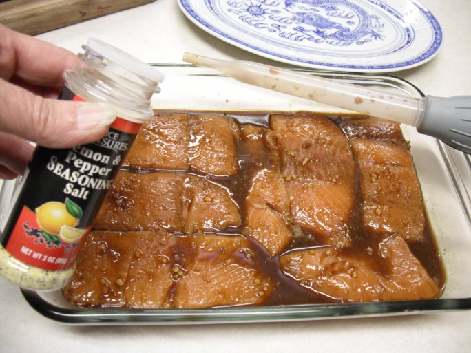 I used a turkey baster to get the marinade onto the top of the fillets and then sprinkled some lemon pepper on top.