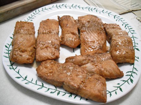 I had a family card party planned at my house recently, and sometimes we all decide to bring something up to snack on while we play. I decided to pull out some Salmon fillets from the freezer and make something snack worthy with it. I came up with a tasty marinade concoction and served it on a platter cut into bite size pieces with some of the marinade cooked down into a thin sauce. It was a hit. There was literally not a piece of salmon left on the plate. This goes well on some nice crackers too, just small enough bites to top one.