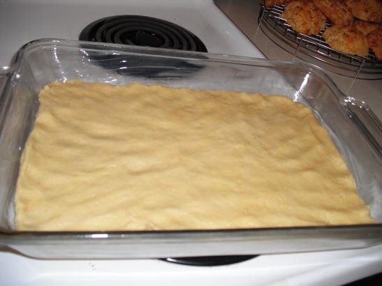 Pat this mixture into the prepared baking pan. (I literally had to pat this in like a pizza dough, it's very dense)