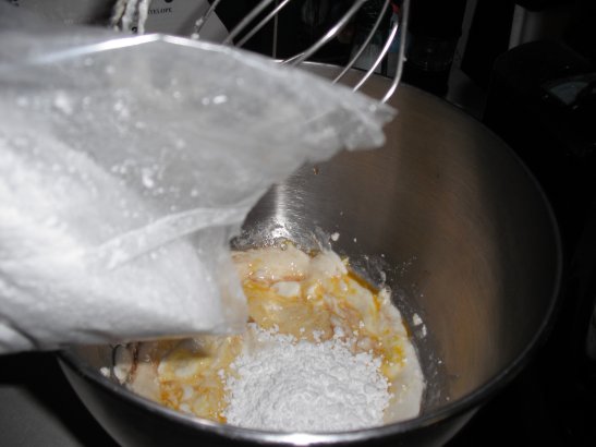 Now dump the powdered sugar in and beat well. Start slow until blended then speed it up, to keep yourself from getting "dusted" .