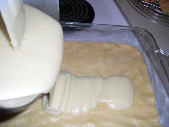 Make sure the topping is even and then place into the oven for 40-50 minutes. Watch it the last ten minutes and be sure to pull it out when the top looks good and golden. If you leave it in longer, you get firmer squares....shorter time is gooey-er. (is that a word? LOL)