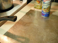 Now we need to get a cookie sheet or flat baking pan to "flip" our potato cake onto. I use a cookie sheet sprayed lightly with non-stick cooking spray.