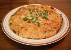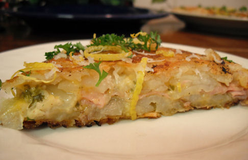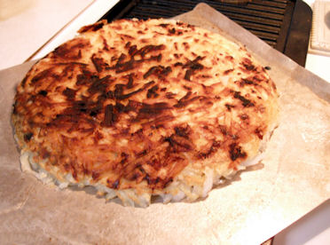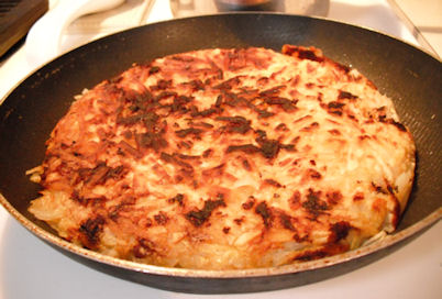 Turn the heat back down to med/low. Cook for another 10-15 minutes, shaking the pan back and forth now and then to keep the potatoes from sticking. When browned and crispy on the bottom, slide it onto a serving plate.