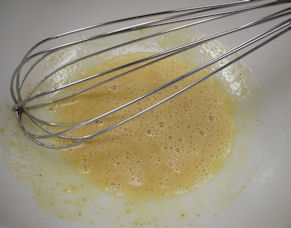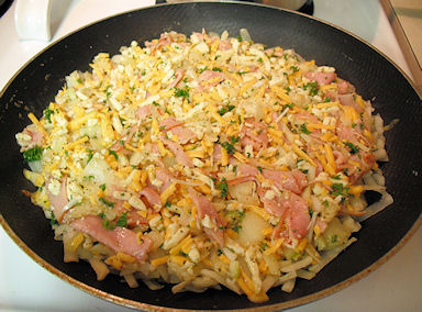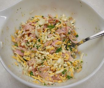 Now add the cheeses, parsley, onions, tarragon, and ham into the liquid mixture and mix until well blended.