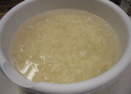 Then fill the bowl with enough cold water to cover the potatoes, and let it sit while you prepare the rest of the ingredients.