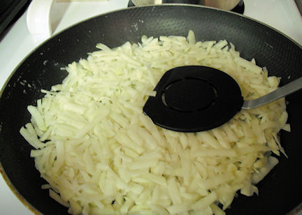 Heat 1/2 of the oil in a large non stick pan or heavy skillet over high heat. When the oil is hot add 1/2 of the potatoes. ( be sure you divide the potatoes evenly or you won't have enough to cover the top. I"ve had to quickly peel an extra potato in the past because I used too much of them on the bottom and realized it too late)