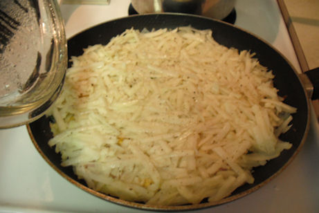 Push the potatoes down with a spatula so they evenly cover the bottom. Salt and Pepper this layer.