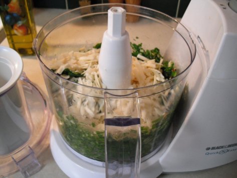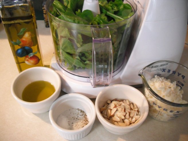 Put the Arugula in the processor and then add the rest of the ingredients.