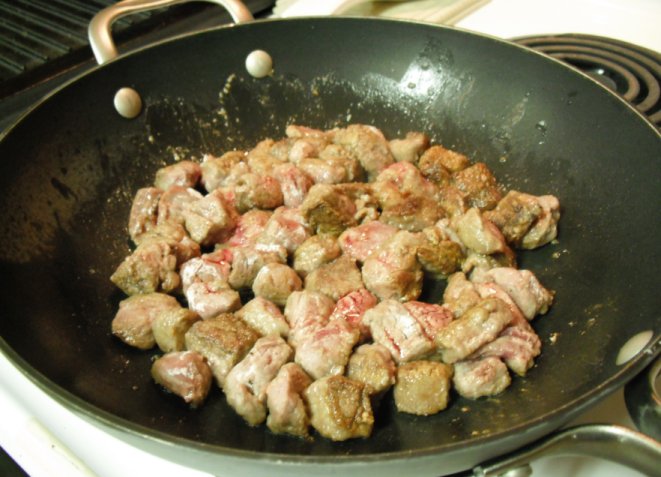 Brown the venison pieces quickly over medium high heat and stir them around so all sides get browned. You may have to add a little butter or fat.