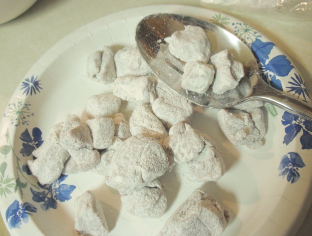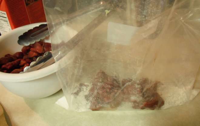 While your pan is heating over medium high heat with the butter or pork fat, put the meat cubes into the bag and shake them up in the flour to cover them.